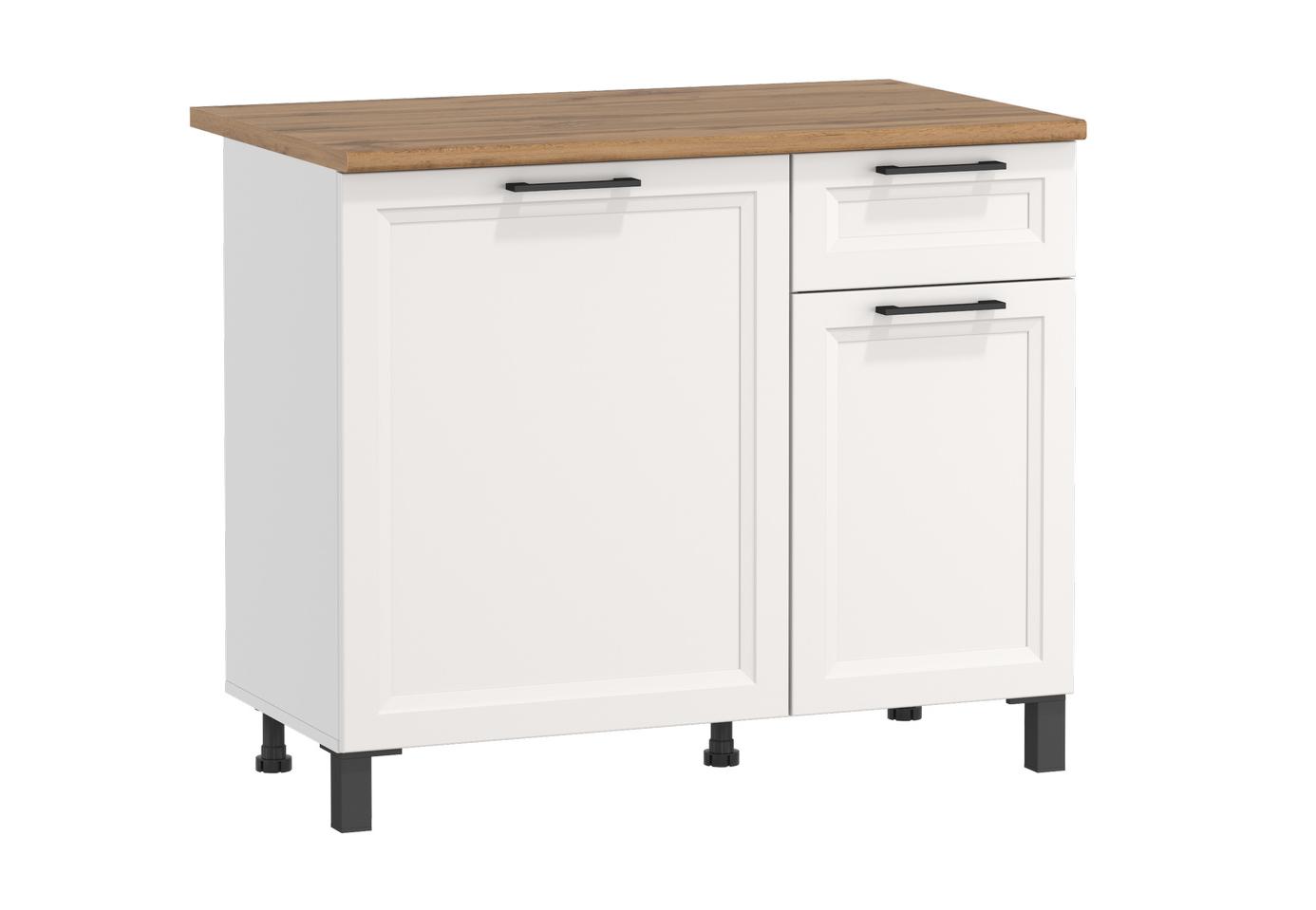 Шкаф Римини (1000) (белый / столешница: дуб вотан / ДВПО: белый / ПВХ белый (О) / профиль: ПВХ белый (О)) исполняется в классическом стиле и спокойных цветах. Модель сочетает в себе простоту и функциональность, но при этом не выглядит громоздко. Она гармонично впишется в пространство, не утяжеляя его.